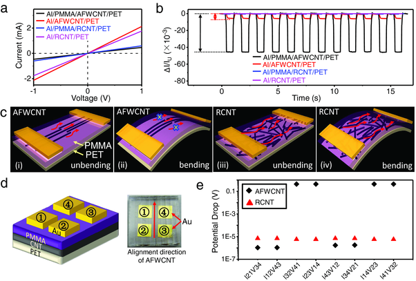(a)Al/PMMA/AFWCNT/PET复合E-Skin(黑线)和控制装置(Al/AFWCNT/PET,红线;Al/PMMA/RCNT/PET,蓝线;Al/RCNT/PET,紫色线)作为未弯曲状态下的施加电压的函数;