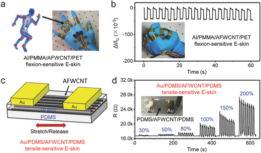(a)在Kepton聚酰亚胺胶带辅助下,示出了用于检测肢体关节运动的屈曲敏感电子皮肤的应用示意图(左)和附着在手指上的PMMA / AFWCNT E-skin的光学图像(右);