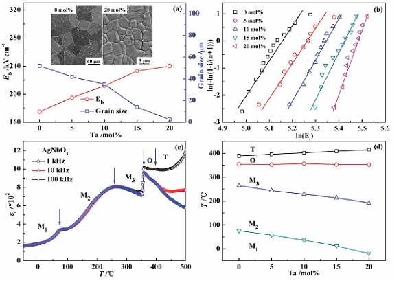 (a)Ag(Nb1-xTax)O3陶瓷的介电击穿强度和晶粒尺寸。插图为AgNbO3和Ag(Nb80Ta0.20)O3陶瓷的微观结构。