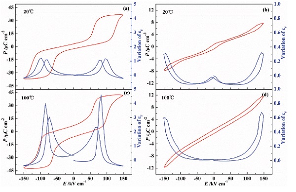(b,d)在20℃和100℃下Ag(Nb0.85Ta0.15)O3陶瓷的电滞回线和介电可调性。