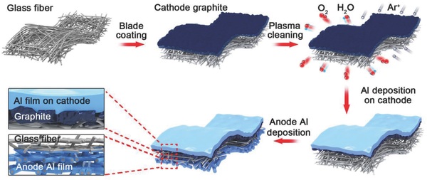 玻璃纤维上通过刮涂一层天然石墨作为正极,Plasma处理后于正极表面沉积一层铝薄膜作为集流体,另一面同样沉积铝薄膜作为负极和集流体。