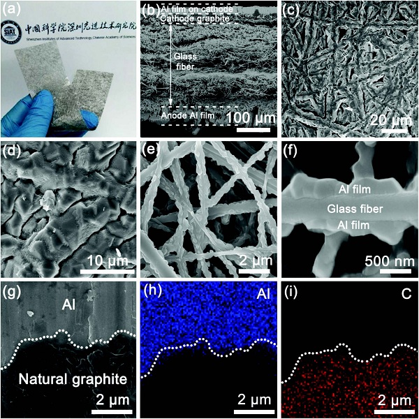g) 阴极和集流体的SEM以及h)Al、i)C的EDX。