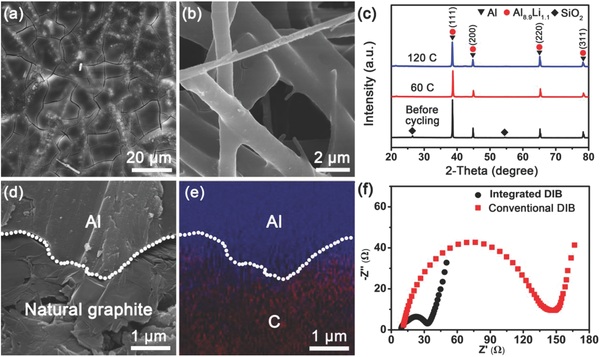 该文章报道了一种集成配置设计的高性能双离子电池,通过铝薄膜磁控溅射沉积在3D多孔玻璃纤维隔膜上形成了多孔阳极,同时隔膜另一面直接负载天然石墨作为阴极并在上面沉积铝薄膜作为集流体。由于3D多孔导电阳极结构和优越的阴极材料与集流体的接触,传输电子阻抗和离子阻抗显著减少。结果,集成DIBs得到120C倍率下116.1mAh g-1的高容量(充放电只需30S)。并且,3D多孔阳极结构能有效缓解体积膨胀,使得60C下长期循环稳定性超过1500次,容量保留达到61%。其能量密度高达232.6Wh kg-1,功率密度22634.5W kg-1。