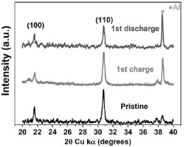 图2 原始KFeF3-KB、首次充电至4.5 V和放电至1.5 V时电极的XRD图谱