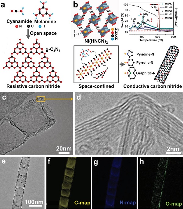 b)导电碳化氮制备的相似CVD路线:Ni(HNCN)2的晶体结构,重量分析法与质谱法联用测定Ni(HNCN)2在Ar2气流下以10 º C/min 升温的表征,这种前驱体同时作为氮源和碳源,在Ni催化反应过程中以挥发的N原子团作为掺氮的原料获得高导电性的富有非石墨化氮的碳材料。