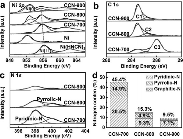 a)以Ni(HNCN)2为前驱体,与金属Ni对比的CCN-700,CCN-800,CCN-900样品Ni 2p的高分辨XPS谱图。