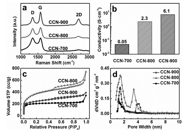 a)拉曼光谱,b)电导率,c)N2吸脱附以及d)CCN-700,CCN-800,CCN-900三种材料的孔径分布。