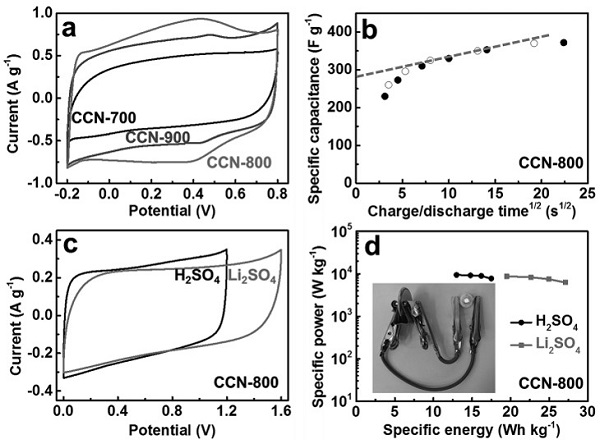 b)CCN-800材料容量相对于半圈循环时间平方根的数据图。实心符号代表CV的测试范围为2到100 mVs-1,空心符号代表CC测试范围为1到20 Ag-1。对称电池的电化学特征为:CCN-800的阴极和阳极在两种不同的水溶液中:1M H2SO4和2M Li2SO4。
