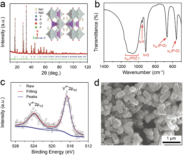 (b, c) NVPF-NTP的FT-IR图谱和高分辨V 2p XPS图谱;