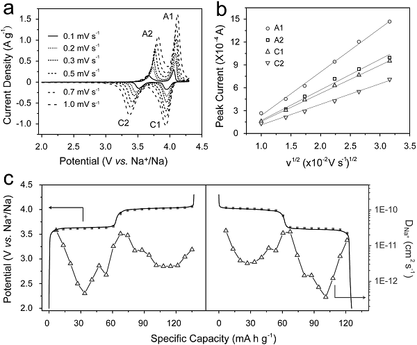 (c) 恒流间歇滴定(GITT)测试,准平衡电位和Na离子表观迁移系数随恒流充放电过程的变化态势。