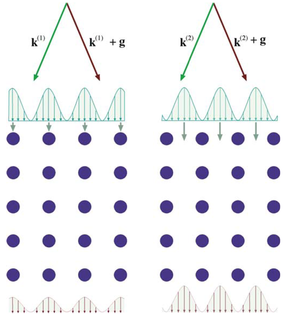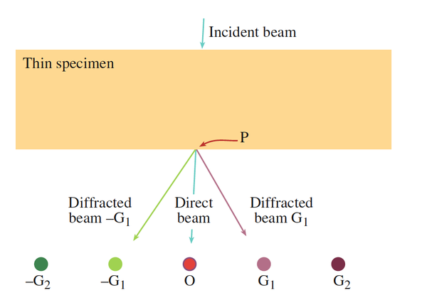 一般在TEM成像分析当中会采用所谓的双光速近似,一个是透射束,一个是衍射束。说实话,这个双光束近似是一个非常非常粗糙的近似,需要满足非常多的条件的时候才可能发生:(1)样品必须是一个比较完美的晶体,没有内应力。(2)入射角度需要非常精细的等于晶体某个晶面的布拉格角。(3)样品和光源要无限大。我们知道,在TEM的电子衍射中,实际可以产生非常多的衍射斑,需要应用Ewald Sphere去分析衍射的。这种多衍射斑产生的原因是由于我们入射的电子束是一个近似的圆斑,当一个有形状的光源照到晶体上时,在倒易空间里,倒易空间的点的形状就是入射光束形状的傅里叶变换(由于电子枪tip本身的曲率不完美,所以聚焦形成的斑不会是一个圆斑,三维上也就不是一个球,而是一个棒子形状的椭球,所以倒易空间点的形状也是一个棒子),这就导致倒易空间的点是一个有形状的斑,Ewald Sphere与这些斑相交的时候就都会产生衍射。