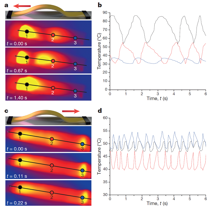 c,d)活性薄膜的短端,平面端和垂直端都固定在惰性的框架上,运动的方向则取决于暴露于外的侧面。