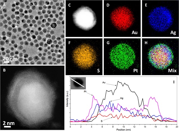 I.插图所示单颗粒中Au、Ag、S和Pt元素径向分布图。