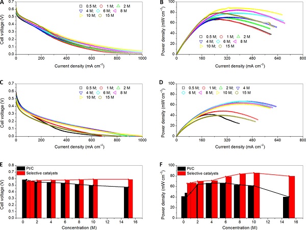 B.不同甲醇浓度下使用选择性电催化剂的DMFC的功率密度曲线;