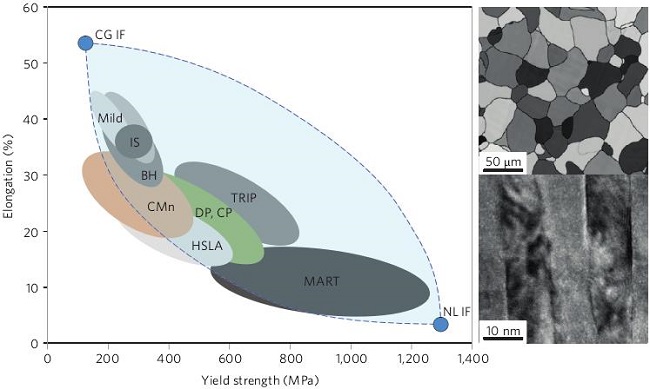 图1显示的是通过缺陷工程在金属材料中引入缺陷而获得的一系列的不同类型钢的强度与延展性能相关性图像。包括各向同性钢(IS),煅烧硬化钢(BH),碳 – 镁钢(CMn),高强低合金钢(HSLA),双相钢(DP),复相钢(CP),马氏体钢(MART)等。这些材料都处于两种极端结构的梯度中:无间隙粗晶(CG IF)和无间隙纳米层(NL IF)。图右上角图像为无间隙粗晶(CG IF)的典型扫描图,其质地软和延展性好, 图右下无间隙纳米层(NL IF)图像的典型扫描图,其硬度大但延展性差。