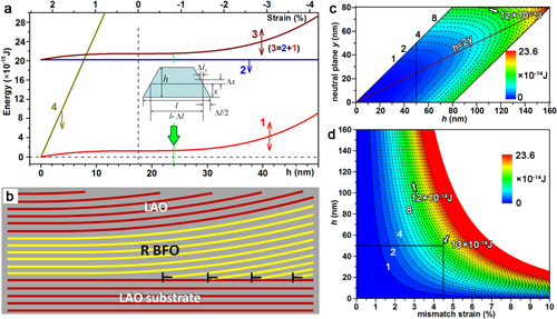 (c,d)分别为应变梯度下和均匀应变下BiFeO3纳米结构应变能随薄膜厚度和中性面或失配应变大小的演化规律。可以看出,在大失配体系下,如BiFeO3/LaAlO3体系,其向错应变梯度引起的弹性能在纳米尺度范围内远远小于均匀失配应变导致的弹性能
