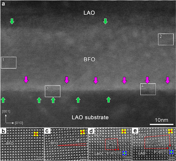 (b)-(d)分别为对应1,2,3和4号矩形区域的放大像。注意(b)和(c)之间的相对晶格旋转,表明BiFeO3纳米结构中可能存在沿面内方向的连续晶格旋转。粉色和绿色箭头分别示意两类不同伯氏矢量的位错,其位错核心区域如(d)和(e)所示。