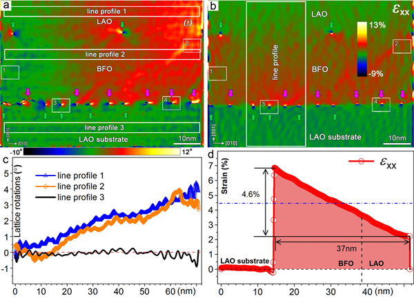 (c)对应(b)中的白色矩形沿面外方向应变线分布。注意在整个BiFeO3/LaAlO3/BiFeO3三层纳米结构中都产生了明显的晶格旋转及其伴随的沿面外方向的线性应变梯度;除了第一层BiFeO3/LaAlO3(001)由高通量沉积制备的界面,其它界面都只有弛豫失配应变的a[010]位错,没有弛豫晶格旋转的a[011]位错,从而使得线性应变梯度能够在整个三层纳米结构中得到保持。