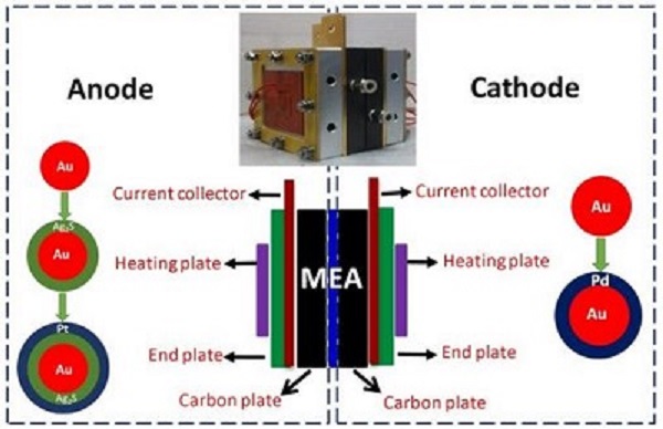 中国科学院过程工程研究所多相复杂系统国家重点实验室研究员杨军课题组的研究者们制备出选择性催化剂,使得在DMFC的阴极或阳极使用的催化材料只对阴极或阳极的反应有催化作用,对另一侧的反应无活性或活性极低。进一步设计贵金属基异质结构纳米材料,充分利用异质材料中的晶格应变效应和电子耦合效应调控材料的催化性能,不仅使材料具有优良的催化活性,而且使材料对DMFC中的甲醇氧化或氧气还原具有很好的选择性。相关研究得到了国家自然科学基金(No. 21376247, 21506225, 21573240)和中科院过程工程所介尺度研究中心(COM2015A001)的资助。研究结果以A selective electrocatalyst–based direct methanol fuel cell operated at high concentrations of methanol为题发表于美国科学促进会(AAAS)出版的国际期刊Science Advances上。