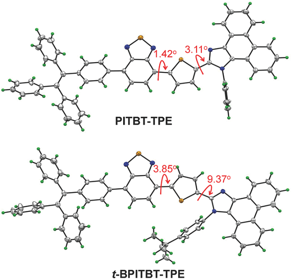 图1 PITBT-TPE (CCDC 1502965) 和t-BPITBT-TPE (CCDC 1502964)的晶体结构
