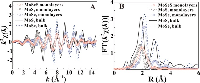 B) 相应的傅里叶变换FT((k)): 单层MoSeS合金(红圈), 单层MoS2 (黑色三角), 单层MoSe2 (蓝色方块), MoS2 块体 (黑色 实线) 和 MoSe2 块体 (蓝色虚线).