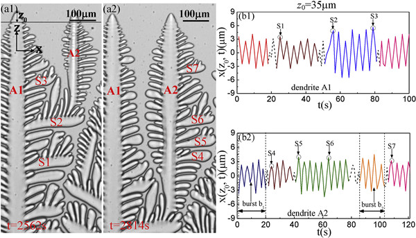 (b1)-(b2) 分别从晶界枝晶A1和A2得到侧枝生长的信号,信号X(Z0,t)对应距枝晶尖端距离Z0=35μm处凝固界面的连续交点