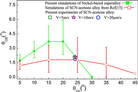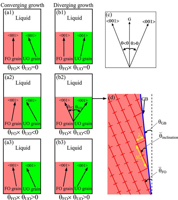在金属的铸造过程中,柱状树枝晶都是由近表面的细小等轴晶初生形成的,其择优取向是由这些晶粒的竞争生长而决定的。传统观点认为,晶粒间竞争生长机制是由有利取向和不利取向枝晶尖端过冷度的差异导致的。而近期研究的现象表明,枝晶尖端过冷的差异并不能完全准确地预测晶粒竞争生长的结果。对于晶粒竞争生长的定量预测,需要全面理解晶界取向和控制参数之间的关系,然而这一关系的建立仍有欠缺。根据晶粒的生长方向,双晶粒的竞争生长形式通常可以分为两种:合并型和分开型。相比于合并型,现有对于分开型晶界取向选择的研究尚有不足。