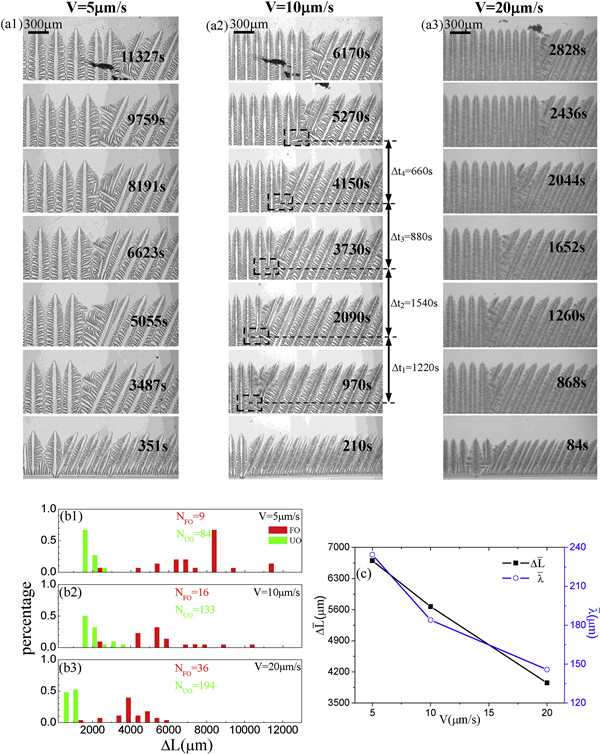 (b1)-(b3) 不同速度下ΔL的分布,其中三个实验在相同条件下,有利取向晶粒(NFO)和不利取向晶粒(NUO)的新主臂数目是已知的;