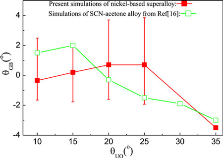 图7 θFO×θUO<0(θFO=-5°)下平均晶界取向θGB随θUO的变化,其中红色折线是现有模型的拟合结果,绿色折线是依据参考文献16的拟合结果