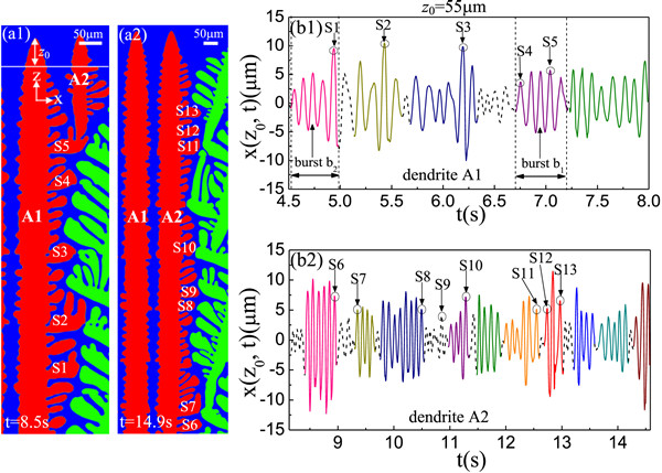 (b1)-(b2) 分别从晶界枝晶A1和A2得到侧枝生长的信号,信号X(Z0,t)对应距枝晶尖端距离Z0=55μm处凝固界面的连续交点