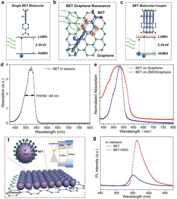 (g)BET和BET与Zn0.9Mg0.1O纳米粒子在甲醇中的光致发光(PL)光谱。