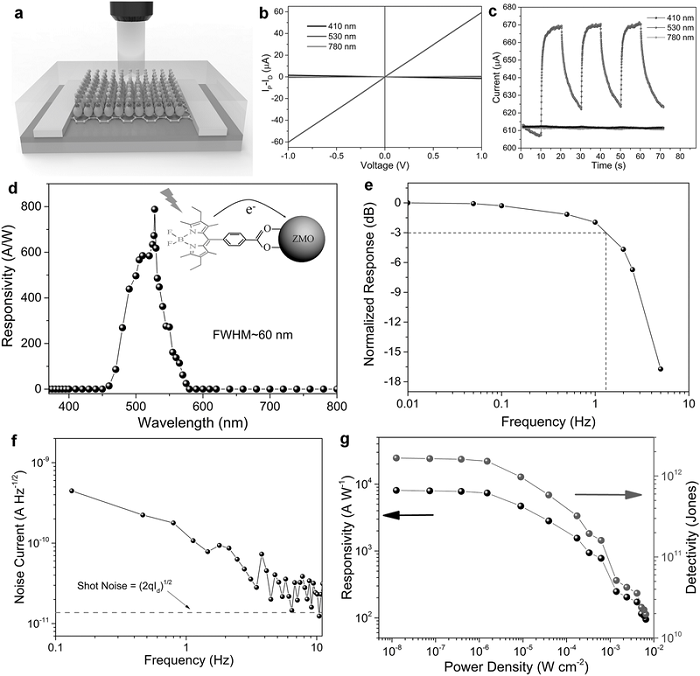 (g)作为PMMA封装的BZG器件的530nm光功率密度的函数,在1Hz下测量的响应度和特异性检测率。