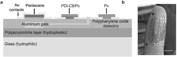 (b)人的手指上灵活的传感器阵列。