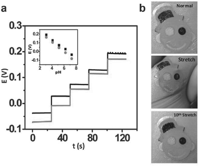 (a)在拉伸(黑色)之前和在GORE-TEX上的第40次(红色)拉伸之后,ISE纹身传感器的pH响应行为。