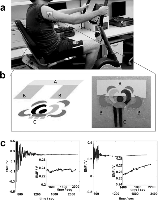 离子敏感电极通过测量工作电极的电位与参考电极的电位相互作用实现。早期研究背后的动力是研究冠状动脉血液体内离子浓度。为达到此目的,利用氢离子载体在柔性离子载体上制作灵敏离子传感器作为传感层嵌入塑化PVC膜。最终,研究人员成功地找到动脉闭塞与猪心脏细胞外区域离子浓度变化之间的相关性。然而,塑化的PVC膜受到与膜粘附,可逆性和次生态敏感性相关的问题的困扰。早期一个突出的作品涉及在柔性聚酯膜上H+敏感氧化钌膜的丝网印刷。与塑化PVC膜相比,这些膜表现出优异的稳定性,重复性和灵敏度。随后,开发了在PI基底上具有氧化铱感测膜的柔性pH传感器,并且这种类型的传感器已经用作活猪食管内、兔子心脏和人的心脏的pH监测器。基于碳纳米管和表面官能化H+受体(PANI/PPy)的pH传感器,旋涂在柔性塑料基材上,显示出增强的pH敏感性。接近于可计敏响应不需要表面官能化的H+受体的柔性纳米结构氧化物膜,例如WO3纳米颗粒,也表现出接近于可编程的行为。人们还报道了在工程和应用方面值得高度注意的发展,其中用于测量表皮pH的柔性传感器以纹身形式构建(参见图8)。最近的研究还提出了一种独特的柔性传感器制造方法,其中将微孔和纳米多孔激光碳化图案转移到PDMS底物,随后用H+受体(PANI)涂覆。