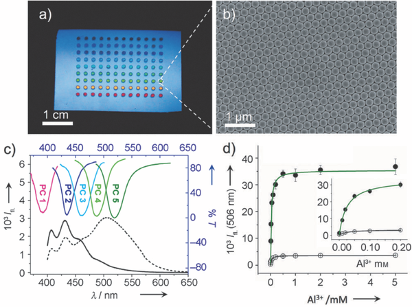 (d)在PC5(*)和空白表面上的506nm处的荧光的Al3+浓度依赖性。