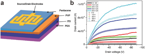 制备FET和基于FET的传感器时,有源层通常通过热蒸发法制造。由于其相对较高的迁移率及其稳定性,因此并五苯是电子和传感器常用的热蒸发半导体之一。Yakuphanoglu等通过采用热蒸发的并五苯作为传感器的活性材料,展示了柔性光电探测器。图17a展示了器件结构,表明该器件包括PES柔性衬底,ITO栅电极,PVP电介质层,热蒸发并五苯活性层和热蒸发的源极和漏极。在有无紫外线辐射度的情况下测量该并五苯系光电探测器的灵敏度。图17b展示了相应的输出曲线。如图17b所示,柔性并五苯晶体管显示出非常好的灵敏度,用于检测UV光。通过热蒸发制备的感光膜相对均匀;然而,还存在一些缺点,例如相对昂贵的设备,低产量和高的时间消耗,所有这些使得该设备不适合于工业生产。