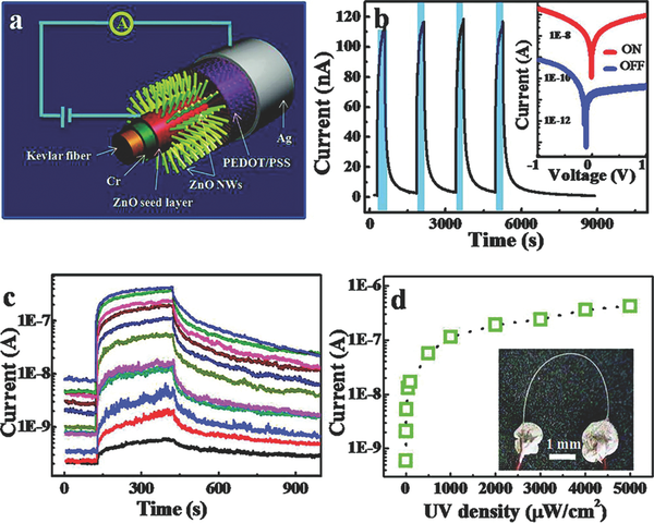 近年来,与相关薄膜结构相比,纳米线,纳米棒和纳米管由于其与传感器独特的性质而受到研究者的高度关注。纳米结构可以通过各种途径实现;化学气相沉积(CVD)方法是常用的方法之一。Liu 等在柔性聚合物基材的顶部展示了CVD生长的ZnO纳米线阵列,如图18a所示。在图18b中展示了用UV光导通和导通的电流曲线,在不同UV强度下得到的电流曲线如图18c所示。CVD生长的ZnO纳米线阵列显示出有利的开关比以及显著的灵敏度。