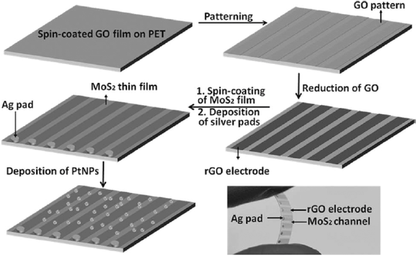 旋涂工艺已广泛用于制造有机电子和传感器,与CVD或热蒸发方法相比,这种方法可以大大降低制造成本。另外,旋涂方法与低成本塑料基材兼容。如图19所示,He等在塑料基板上描述了旋涂单层MoS2气体传感器。首先,在PET基板上形成GO膜以作为源极和漏极两者。然后,通过旋涂在顶部沉积MoS2活性层。柔性传感器阵列显示出高灵敏度来检测有毒气体,并且通过沉积Pt纳米颗粒进一步改善其灵敏度。Zirkl等人展示了基于旋涂的热电聚(亚乙烯三氟乙烯)[P(VDF-TrFE)]共聚物膜的光热传感器,如图20所示。传感原理与铁电P(VDF-TrFE)共聚物中的热电效应有关。这些柔性传感器表现出良好的灵敏度.