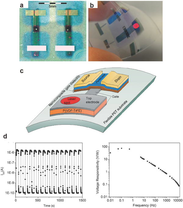 光能为地球提供能量,使眼睛能够看到世界。可将光信号转换为电脉冲的光传感器或光电检测器对于大多数现代光学和光电子应用是不可或缺的。使用大面积批量生产兼容工艺在塑料基板上有助于进行灵活,轻便和透明光传感器的制造。光的检测通常包括以下四个过程:i)光吸收,ii)激子扩散,iii)激子解离,iv)电荷转移和收集。光传感器需要具有特定的光谱响应范围,并且具有响应时间短,量子效率高,响应度高,归一化检测和宽线性动态范围的特点。光电检测器的感测光谱范围对于包括但不限于环境监测,通信和监视在内的无数基础和实际应用至关重要。因此,这需要开发在紫外(UV,<400nm),可见光(400-700nm)或红外(IR)(>700nm)光谱范围内独立工作的光传感器。光传感器通常需要快速响应以在短时间内检测入射光。响应时间是达到稳态或最终值或曲线上升/衰减时间常数63.2%所需的时间。预期更深层次的陷阱需要更长的时间才能释放电荷,从而导致响应缓慢。用于表征激子产生过程参数的量子效率是通过光产生的电子-空穴对或光电子与入射光子数的比例确定的。高外部量子效率是高光电探测器性能水平的先决条件。因为它不仅显示了多大可以通过给定的光照射产生光电流,而且可以反映另一个被称为光电流/暗率的重要参数,从而对器件面积和响应速度的变化进行归一化。这允许不同设备之间的比较。因此不仅需要高光电流而且还需要低暗电流来实现高性能的光传感器。驱动和切换显示器时,大的光电流和高的光电流/暗率均不可或缺。从结构角度来看,通常使用两种类型的光传感器,即光电二极管类型和光电晶体管类型。光电二极管是具有两端电极的半导体器件。该结构的简单性便于制造和操作。光电二极管通常具有快速的响应时间,在直接间隙半导体的情况下,可以微秒或更小的值测量。1951年由William Shockley率先推出的光电晶体管是三端器件;光电晶体管使用光子流作为附加终端。它们能够在单个器件中实现光检测,光调制,电场控制切换和信号放大的功能。通过晶体管动作可实现特别大的增益,因为施加栅极偏置会导致耗尽区可以发生光诱导的激子有效分离成电子和空穴。随后,这些电荷载流子通过源极-漏极电压被加速到源极和漏极。光电晶体管的噪声可以被抑制到比其他光检测器的噪声值低得多。除了高光敏性和响应度值之外,光电晶体管非常适合于与常规电子电路集成,因为独特的结构场效应晶体管(FET)与CMOS技术的兼容性允许其小型化。因此,光电晶体管可以应用于物联网设备,并符合摩尔定律。近年来出现的二维石墨烯由于其高迁移率而被用于光电晶体管中的柔性通道材料,其导电性高,化学稳定性好,微细加工和纳米制造容易。石墨烯的固有超灵敏度为这种材料探索新的传感器和光电子器件提供了巨大的机会。碳纳米管也被用于改善光感测。CdSe,CdS,Fe3O4,CdTe,TiO2,NiO,Co3O4,Mn3O4等材料的量子点近来受到光传感器的关注。量子点装饰石墨烯以形成兼容的异质结构,并获得尺寸依赖的半导体光学性质。设想纳米颗粒中的多载体效应可以通过载体倍增来提供光学增益和性能。与其无机对应物相比,集成在轻质,可折叠塑料基板上的有机电子器件或电路具有许多基本优点,并且对于使用常规无机电子学难以实现的电子显示器,电子智能卡或生物医学系统中的应用显示出巨大的前景。此外,当用低温程序(如印刷技术或卷对卷加工)制造时,有机电子的制造过程应该便宜得多,更环保。有机物最根本的区别属性器件是它们的化学通用性允许通过人造分子设计轻松地进行光电性能特征的分子官能化和化学工程,以提供对光和电刺激的高灵敏度,从而允许将能量转换,光检测和信号放大集成在一个设备上。尽管共轭聚合物可以容易地以低成本加工,具有物理灵活性,并且在大面积覆盖下,小分子半导体及其复合材料更容易获得,并且倾向于形成更有序的域用于较高的载流子传输,导致极大的改善设备重现性。然而,一些缺陷可以增强光电流响应性。Kim等在石墨烯上使用等离子体和离子照射来诱导不同类型的表面缺陷的形成,例如空隙,石墨烯岛,掺杂和杂质,破坏了蜂窝晶格。这些缺陷强烈地散射入射光,以提供比原始石墨烯更有效的光吸收。尽管对光电二极管和光电晶体管进行了广泛的研究,光电流/暗率仍然低于六个数量级。有机光依赖电阻(OLDR)取得了突破;每个由作为负载电阻器的有机电阻器(OR)组成,其中有机场效应晶体管(OFET)作为读出元件。这种类型的光电传感器是跨导型而不是电导型;因此,这种类型可以提供比另一种类型高八个数量级的光电流/暗率。由于研究没有报告归一化的检测性,为了比较不同器件的性能水平将是具有挑战性的。虽然已经取得了明显的进展,但是需要进一步的研究来优化性能。