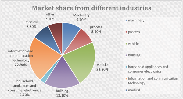 图22 由不同工业领域预测的2016年传感器市场份额
