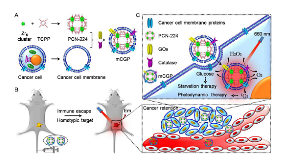 目前,癌症的治疗仍然存在着诸多的困难。而选择性地切断肿瘤细胞的营养供给及其代谢途径,将是提高肿瘤治疗效率的有效途径。在此基础上,研究人员提出构建了一种肿瘤靶向级联生物反应器,并将其命名为mCGP;这种生物反应器通过嵌入到由癌细胞膜修饰的卟啉金属有机骨架(MOFs)中和葡萄糖氧化酶(GOx)以及过氧化氢酶相作用可用于肿瘤细胞的饥饿和光动力学疗法。