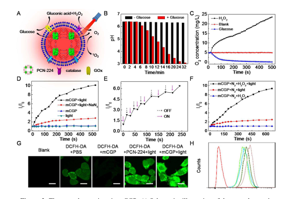 F)在不存在O2且H2O2,光照或H2O2和光照都存在的条件下SOSG的荧光变化;