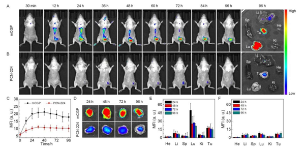 E,F)在多次静脉注射mCGP或PCN-224后,对主要器官和癌变组织进行半定量MFI分析。