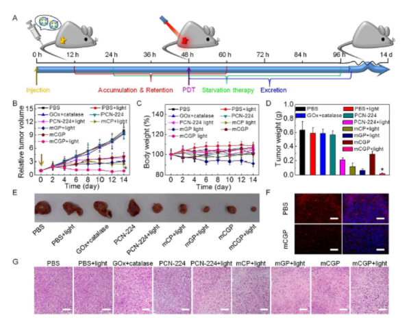 A)癌症靶向,保持,排泄行为和mCGP协同饥饿及光动力疗法的示意图;