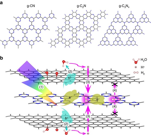 (b)光催化(水分解)氢气生成和储存方案:(1)光生电子(e–)和孔(h+)分离;(2)通过孔(h+)攻击水分裂产生质子(H+);(3)质子(H+)穿过GO并产生H2分子;(4)禁止H2分子从三明治结构(以GO-CN-GO为例)中移出。蓝色,灰色,粉红色和红色的球珠代表N,C,H(H+)和O原子,黄色和浅蓝色云代表光生电子(e–)和孔(h+),蓝色和品红色箭头代表相应颗粒的迁移。