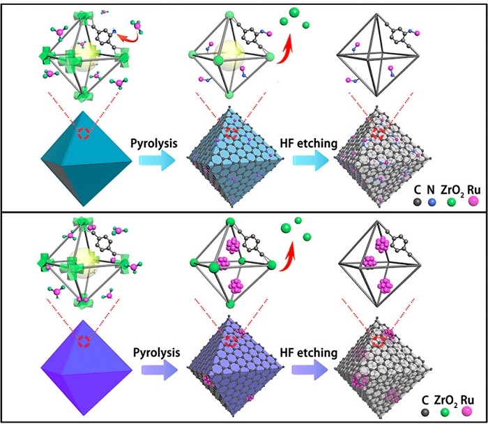 图3 Ru SAs/N-C(顶部)和Ru NCs/C(底部)形成机理的方案