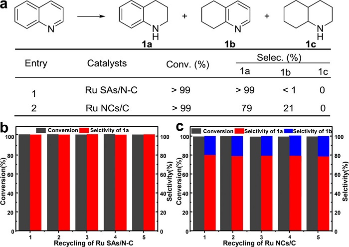 (a)Ru SAs/N-C和Ru NCs/C催化剂对喹啉区域选择性氢化的催化性能;