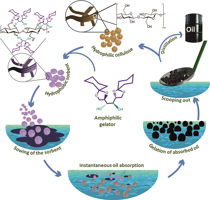 近期,来自印度科学教育研究所的K. M. Sureshan教授(通讯作者)等人在Angew. Chem. Int. Ed上以题为 “Organogelator–Cellulose Composite for Practical and Eco-Friendly Marine Oil-Spill Recovery” 发表了关于采用糖源的有机小分子凝胶因子——1,2,5,6-二-O-亚环己基-D-甘露醇(PSG)作为添加剂加入纤维素纸浆中,得到了一种新型的溢油吸附剂。该吸附剂可以从油水混合物中有效的分离石油,同时凝胶因子在油中均匀释放并自组装在纤维素上,将溢油凝固在纤维素纸浆基体上,因此该工作所制备的高效吸附剂具有潜在的应用价值。