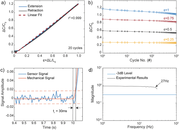 (d)频率扫描测试:传感器拉伸到10%应变时,频率从1 Hz增加到30 Hz。